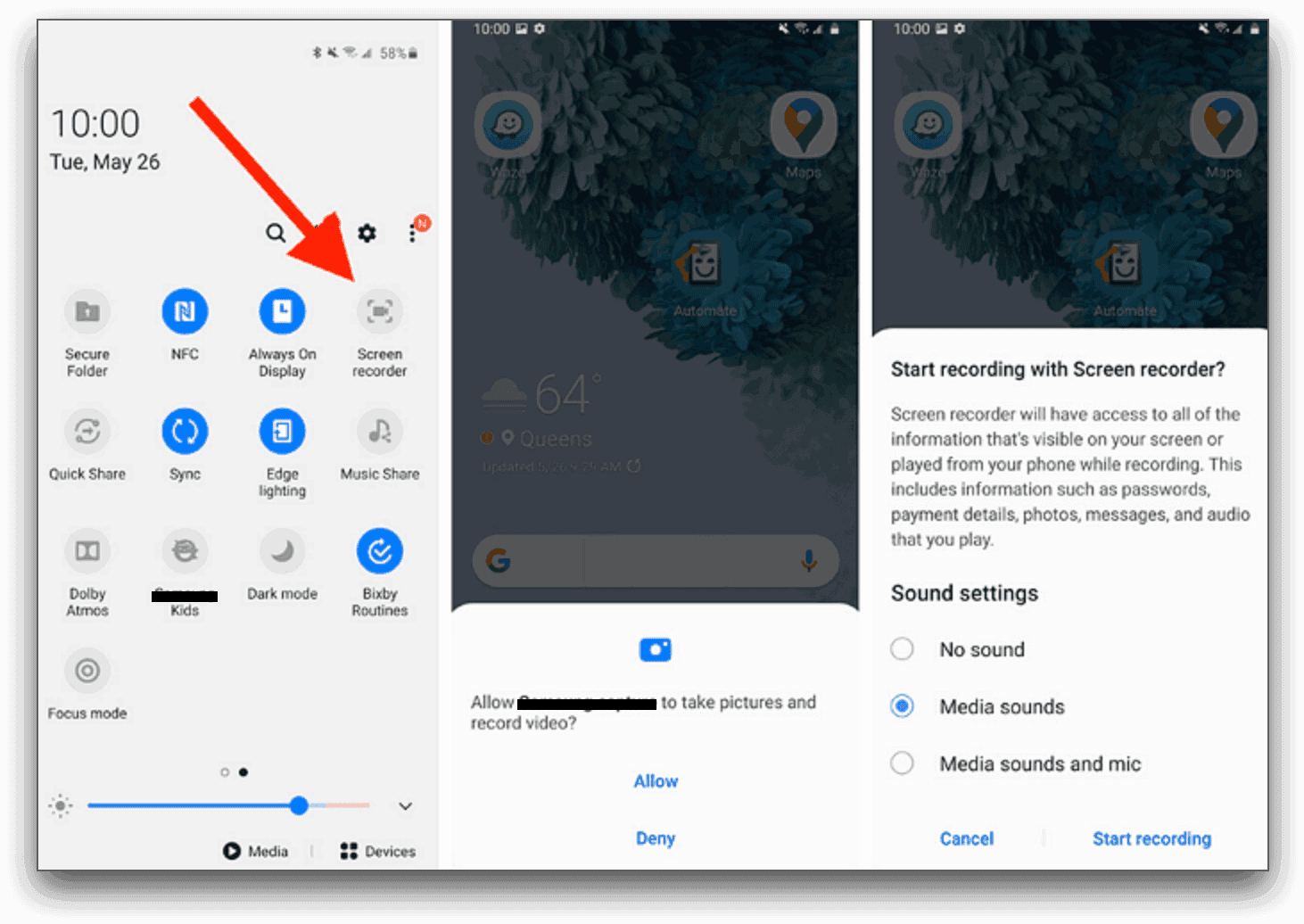 Step 2. Look for the “screen recorder” icon and tap on it. If you can’t find it, tap the Plus symbol, select the “screen recorder” symbol, and drag it onto your “Quick Settings” menu. You’ll be prompted to choose your audio recording preferences—whether to record media sounds, the microphone, or no audio. Once selected, tap “Start recording.”