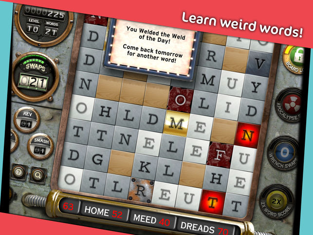 The ultimate word extraction game. Weld words in the word machine! Create clever combos and multiply your score using gem and gold tiles. Increase your vocabulary using the in-built dictionary – discover definitions of words you never even knew existed! Earn powerful special abilities like Group, Reverse, and Jump Swaps, and complete particularly tricky terms with blank wooden pieces. Potentially unlimited gameplay!